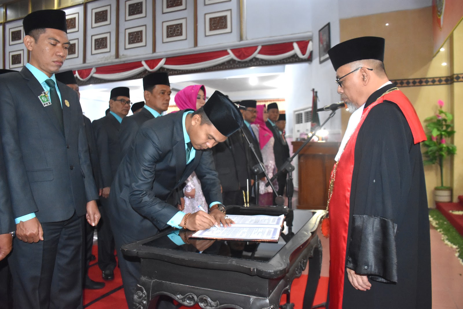 Mojokerto – majalahmojokertopos.com : 50 orang anggota Dewan Perwakilan Rakyat Daerah (DPRD) Kabupaten Mojokerto masa jabatan 2019-2024, resmi dilantik Ketua Pengadilan Negeri Mojokerto Muslim, Sabtu (24/8) siang di ruang Graha Wichesa Gedung DPRD Kabupaten Mojokerto.
