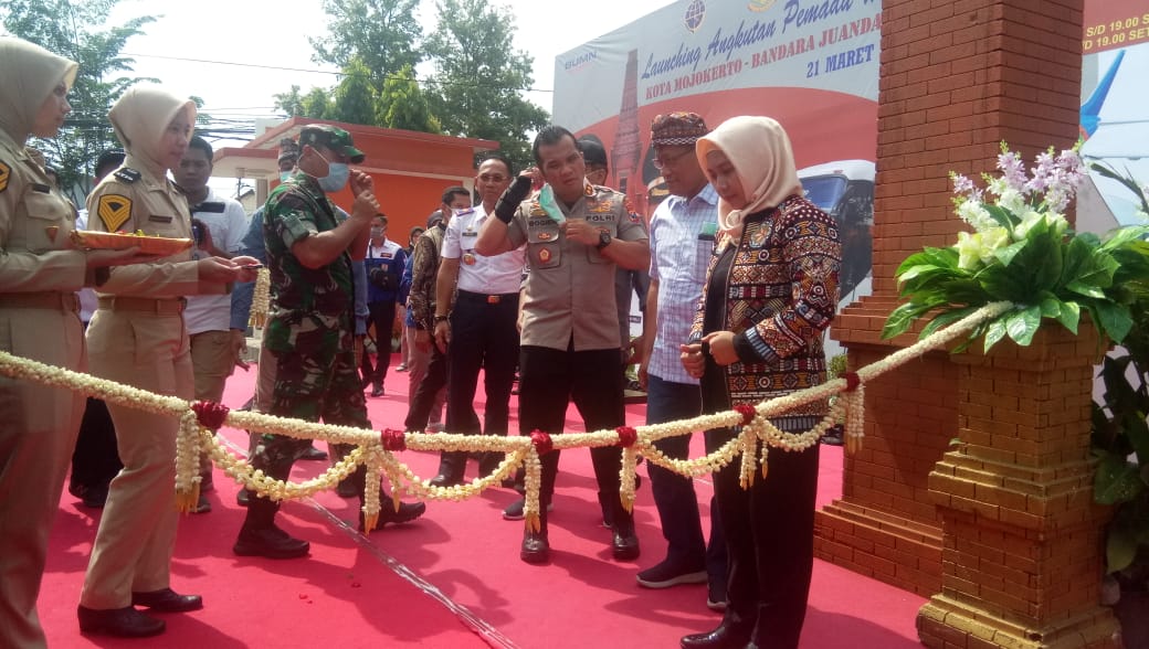 Mojokerto – majalahmojokertopos.com : Wali Kota Mojokerto Ika Puspitasari bersama Wakil Wali Kota Achmad Rizal Zakaria, meresmikan Angkutan Pemandu Moda Kota Mojokerto – Bandara Juanda, di Halaman Graha Mojokerto Service City (GMSC) Sabtu (21/3/2020). Bus Bandara yang mulai beroperasi pada hari ini, merupakan bagian aksesibilitas layanan angkutan umum yang selaras dengan program Kota Mojokerto sebagai Kota Pariwisata.