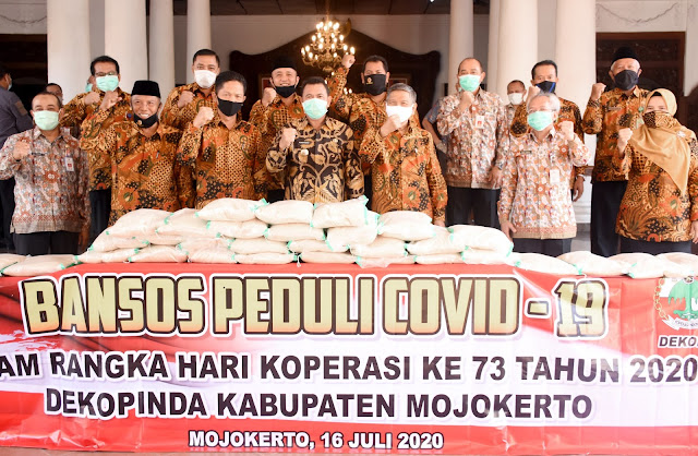 Sebagai informasi, sebelum meresmikan Kampung Tangguh wilayah Kecamatan Gedeg, bupati menerima secara simbolis bansos penanggulangan pandemi Covid-19 dari Dewan Koperasi Indonesia (Dekopin) Kabupaten Mojokerto berupa dua ton beras. Bantuan yang diberikan di peringgitan rumah dinas bupati ini, sekaligus dalam rangka memperingati HUT Koperasi ke-73.(Tik)