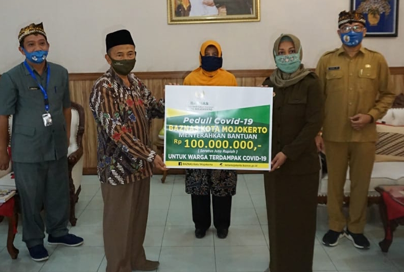 Badan Amil Zakat Nasional (Baznas) Kota Mojokerto menyerahkan bantuan Covid-19 senilai Rp 100 juta kepada Pemerintah Kota Mojokerto. Bantuan yang diserahkan secara simbolis oleh Ketua Baznas Ma’shum Maulani diterima langsung oleh Wali Kota Mojokerto Ika Puspitasari, di Rumah Rakyat Hayam Wuruk 50, Magersari, Senin (18/5/2020).