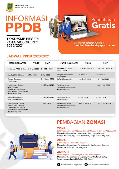 Sementara itu, pendaftaran penerimaan peserta didik baru secara online di wilayah Kota Mojokerto sebenarnya telah diterapkan sejak tahun 2019. Hanya saja, saat itu penerapan PPDB online baru diperuntukkan pada jenjang SMP Negeri. Sedangkan pada tahun ini, Pemerintah Kota Mojokerto mulai menerapkan PPDB online secara keseluruhan. Mulai dari jenjang TK, SD hingga SMP. Pendaftaran PPDB online pada jenjang TK, SD dan SMP, pemerintah daerah melalui Dinas Pendidikan menerapkan sistem zonasi. Dimana, sedikitnya 50 persen peserta didik merupakan warga beridentitas kota.