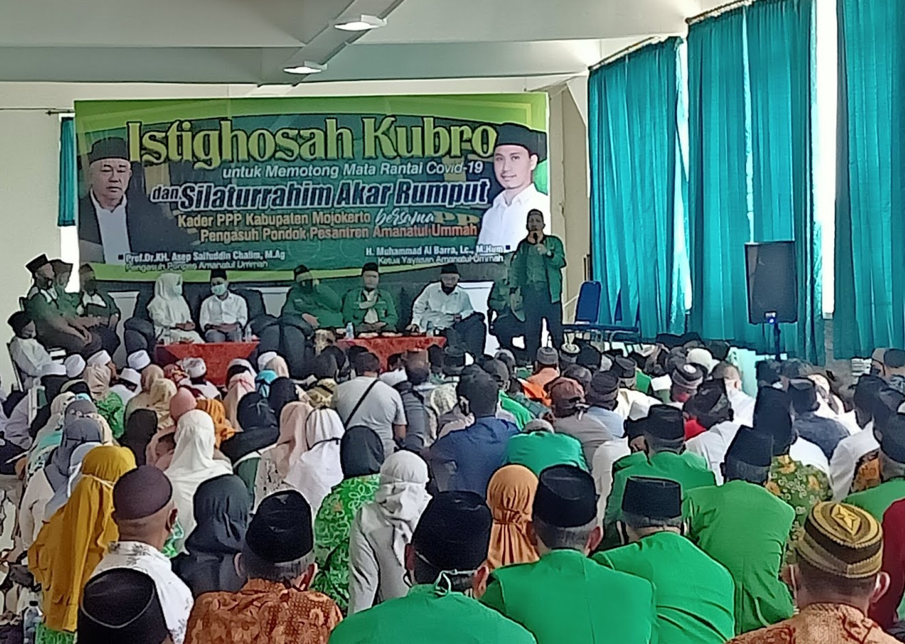 Mojokerto Pos- Pengasuh Pondok Pesantren Amanatul Ummah menggelar Istighotsah Kubro dalam memotong mata rantai Covid-19 dan silaturahim akar rumput kader PPP Kabupaten Mojokerto, Minggu (12/7/2020) di Pondok Pesantren Amanatul Ummah Kembangbelor, Pacet, Kabupaten Mojokerto.