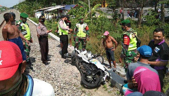 Korban selamat setelah sempat terpental hampir 5 meter, saat mengendarai motor dengan nopol S 2669 KQ dan menyeberang rel KA tanpa palang pintu di Desa Paji.